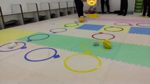 決められた的に向かってお手玉を投げ、距離に応じて得点が変わるルールを設定し、総合得点で勝敗を決める取り組みを行いました✨