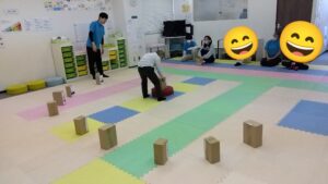 子どもたちはスタート地点から頭にお手玉を乗せたままゴールを目指して進みます。散らばったマーカーにお手玉が当たると、自分のマーカーへチェンジ✨