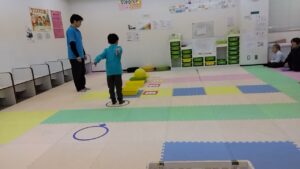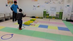 決められた的に向かってお手玉を投げ、距離に応じて得点が変わるルールを設定し、総合得点で勝敗を決める取り組みを行いました✨