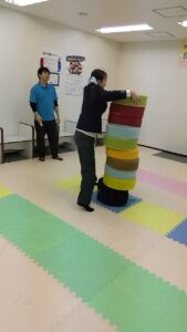 新聞紙の上にクッションを乗せ、手を使わずに制限時間内でどれだけ高く積めるかに挑戦しました。