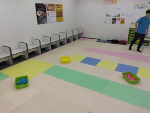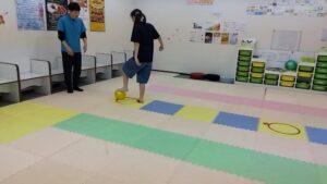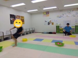 スタート位置にカゴを置き、近距離・中距離・遠距離にそれぞれボールの入ったカゴを設置。子ども達は 制限時間20秒 の中で好きな場所からボールを一つずつ持ち帰り、スタート位置のカゴへ集めました。