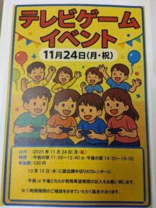 このたび 11月24日(月・祝) に、子ども達が楽しみながら協力・交流できる 「テレビゲームイベント」 を開催いたします👏